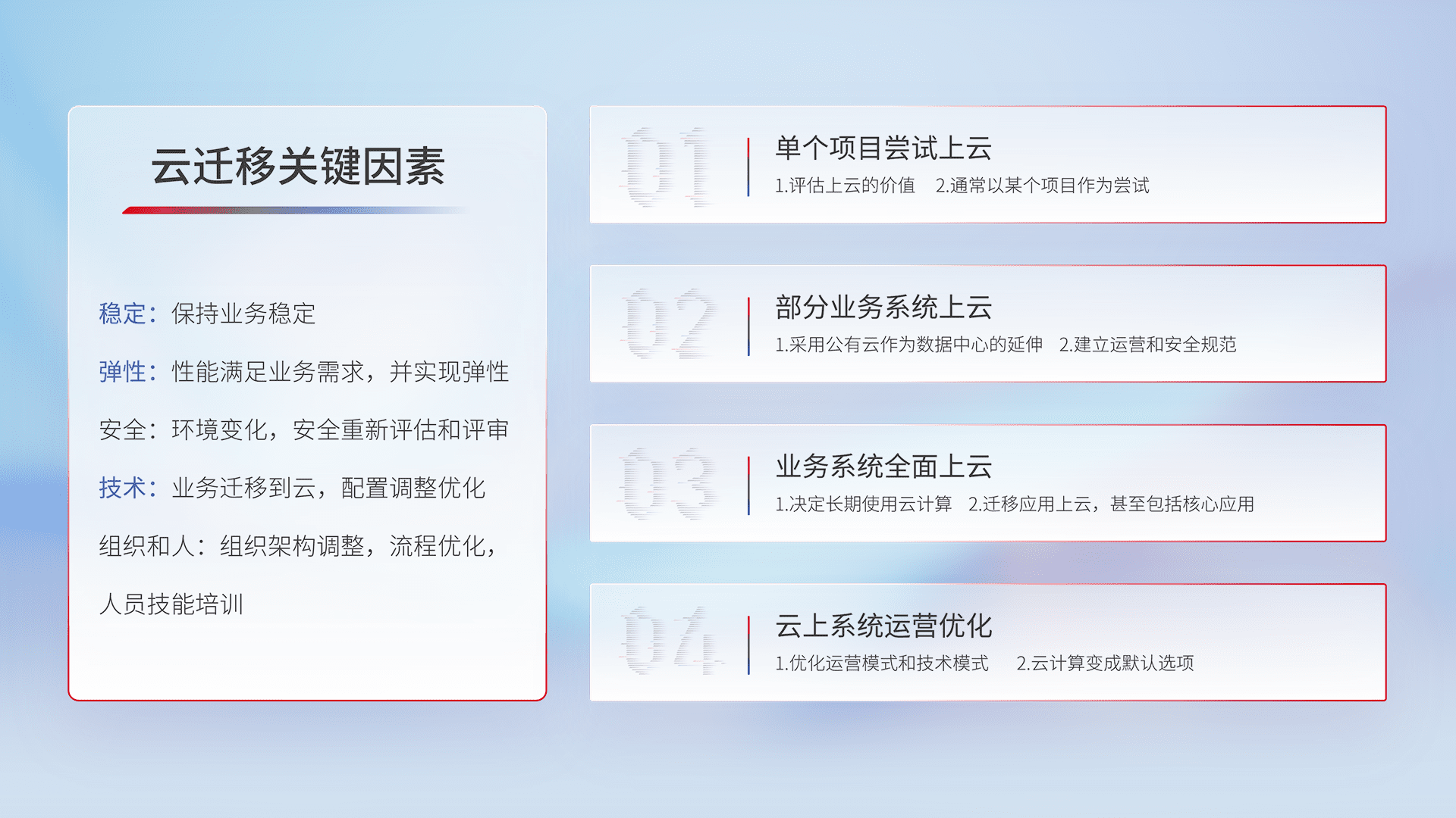 结合实际业务,,,从规划设计、、云平台选型、、、云原生改造、、、、数据迁移、、、、集成交付,,迁移全过程为客户识别最佳上云路径,,,做好风险识别管理,,设计网络架构、、身份权限、、、安全审计合规、、操作审计、、日志审计、、监控告警策略、、、、多站点容灾设计等,,,对云上基础设施进行整体规划,,提升IT治理水平,,,,以满足弹性、、、、高可用、、高性能的需求。。